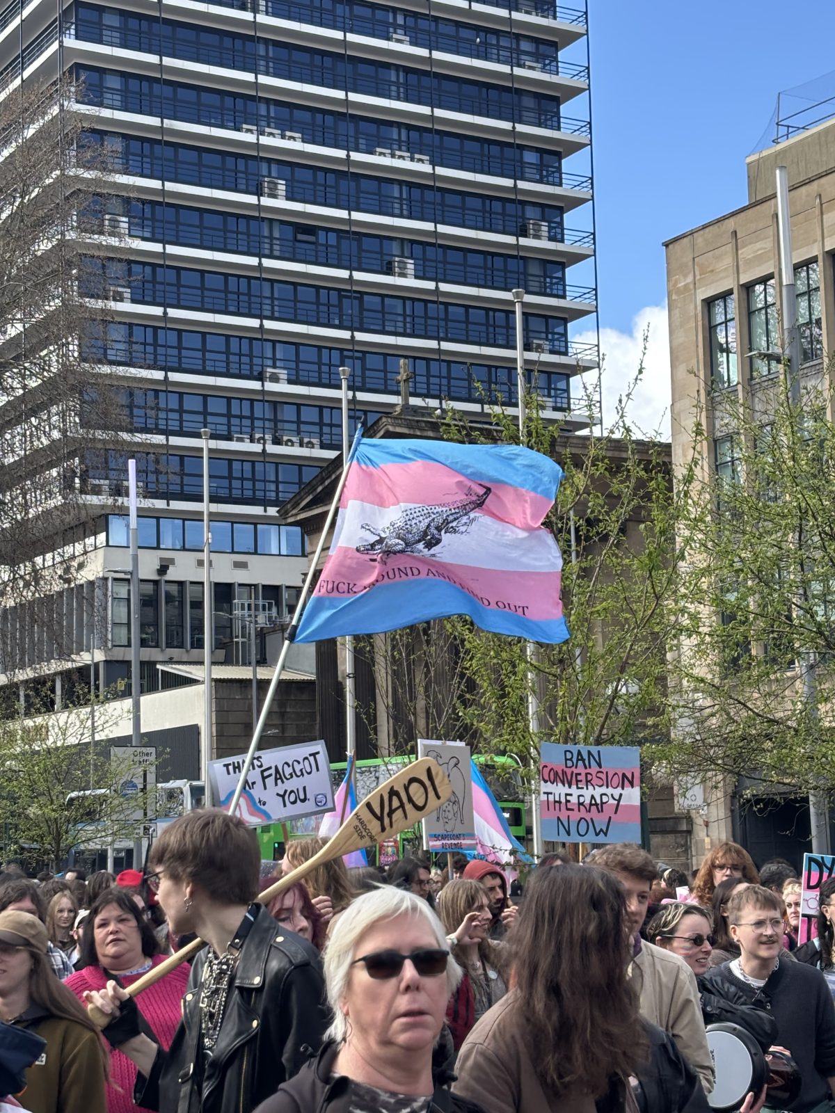 Zberemo se na trgu v centru Bristola. Na odru se zvrstijo govorke_ci, med drugim poslušamo tudi poezijo o krčenju dostopa do zdravstvenih storitev v Združenem kraljestvu. Povsod so roza-modro-bele zastave in osebe z barvitimi vzorci na obrazih in laseh. Kaj kmalu se začne množica pomikati po mestnih cestah. S fantom po naključju korakava ob posebej glasni trans punci, ki ji niso všeč preveč splošni vzkliki o lepoti transspolnosti, zato začne skandirati po svoje, in mnoge_i se ji pridružijo: »Faggots and dykes, bottoms and tops, we hate TERFs and we hate cops!« [Nekaj v smislu: »Pedri in lezbe, kdor jaha in kdor daje, vsi sovražimo terfice in policaje!«]
